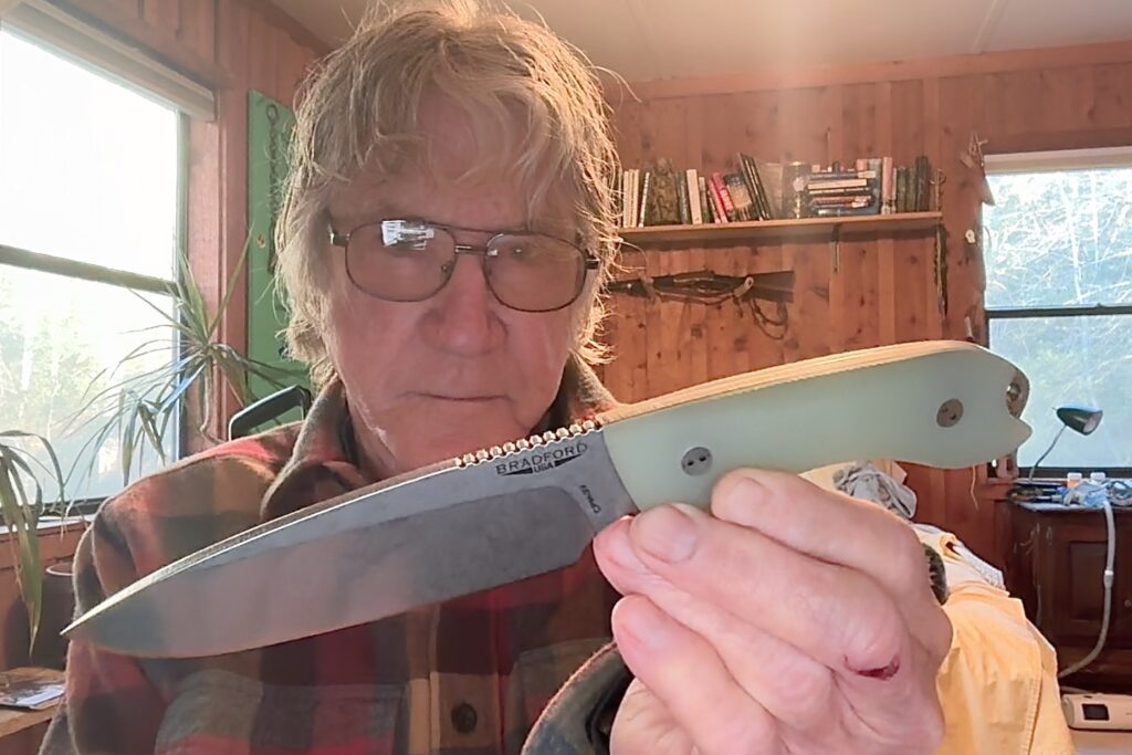 The Guardian 5 blade, for those who may wish to know, is finished in what Bradford calls “stonewash;” the blade is ground to a sabre edge. The handle is made of G-10, a high-pressure fiberglass laminate of cloth and epoxy resin. It’s exceptionally strong, moisture-resistant and lightweight. Its light green finish is called “ghost.”